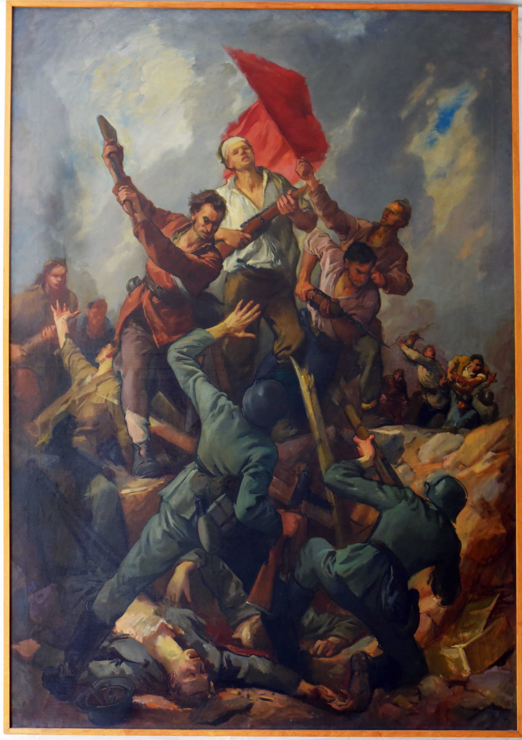Slika „Juriš“ Ismeta Mujezinovića citira sliku „Sloboda vodi narod“, francuskog slikara Eugena Delacroixa. Delacroix, opisuje događaje iz Julske revolucije 1830. godine kada je kralj Karlo X bio primoran da se odrekne vlasti, nakon što je nezadovoljni narod digao ustanak. Mujezinović je čuvenu revolucionarku Marianne, personifikaciju slobode i razuma sa francuske historijske scene, zamijenio jugoslovenskim revolucionarnim kontekstom. Ismet Mujezinović, koji je i sam bio učesnik narodnooslobodilačke borbe, koristi jezik umjetnosti da materijalizira sjećanje na borbu protiv fašizma. Za Mujezinovićevo platno je bitan kolektiv i njegova razorna snaga koja mijenja poredak, bitna je masa ujedinjena u svojoj žudnji za slobodom. Vrh Mujezinovićeve piramidalne kompozicije je zastava kao simbol društvene revolucije, pa se ona može smatrati „glavnim likom“ priče. Slika Juriš Ismeta Mujezinovića je bila dio stalne postavke Muzeja revolucije BiH. Slika je korištena kao didaktički materijal u objašnjavanju historijskog narativa, a njeno značenje je dopunjeno kolažiranjem sa predmetima/puškama.